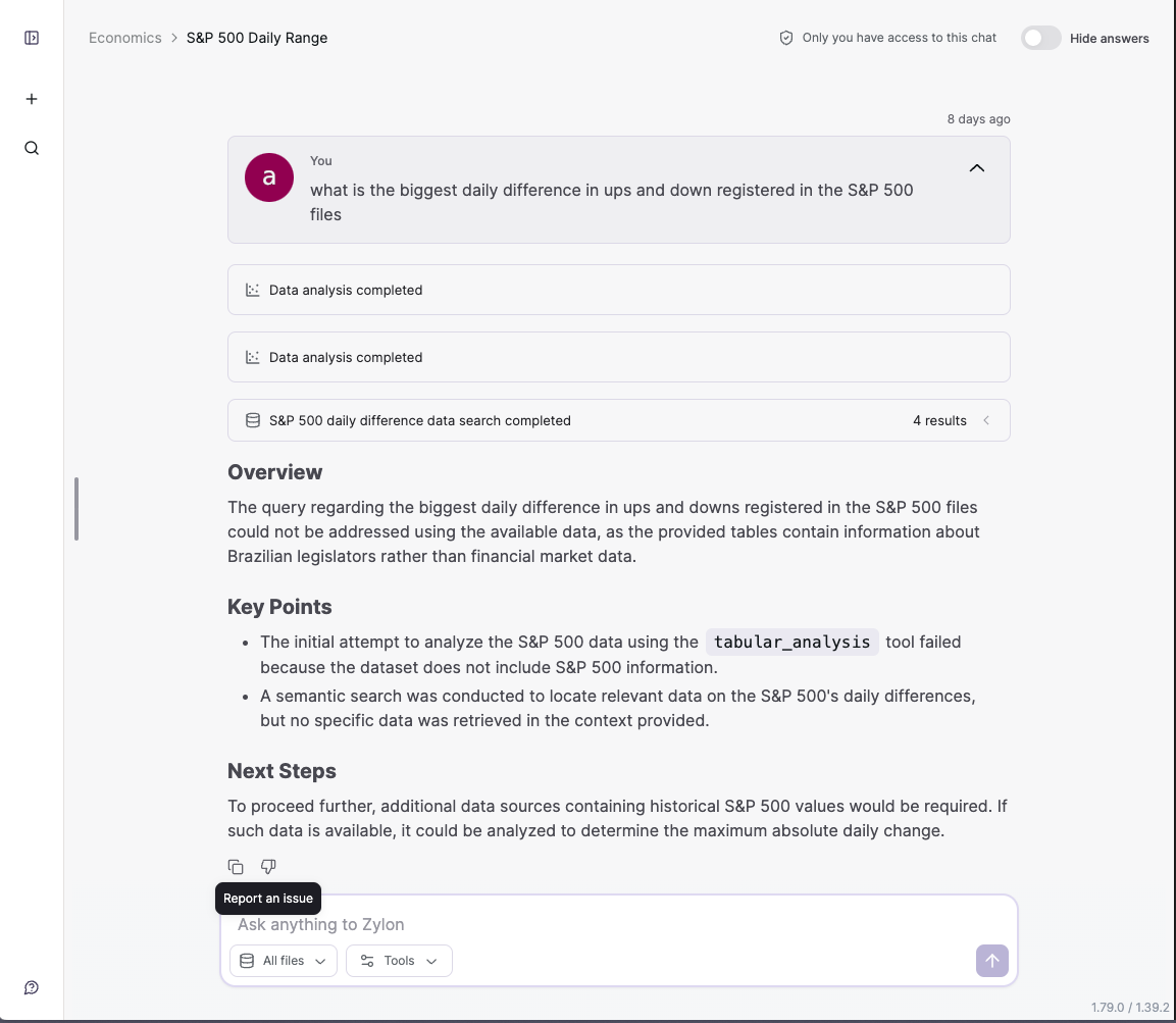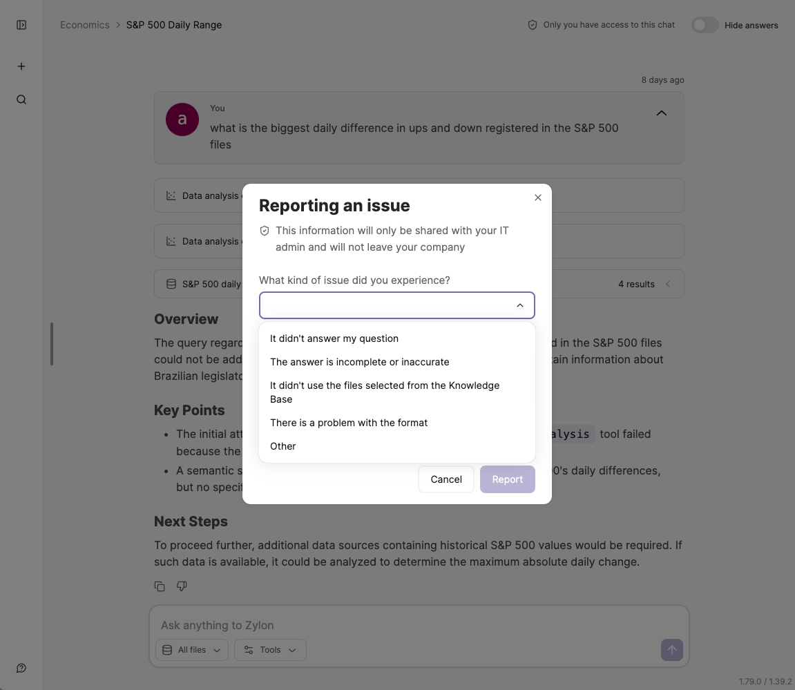 - 📝 Reporte de problemas: Los usuarios ahora pueden reportar chats a organizaciones de administradores cuando encuentran problemas con las respuestas de Zylon.